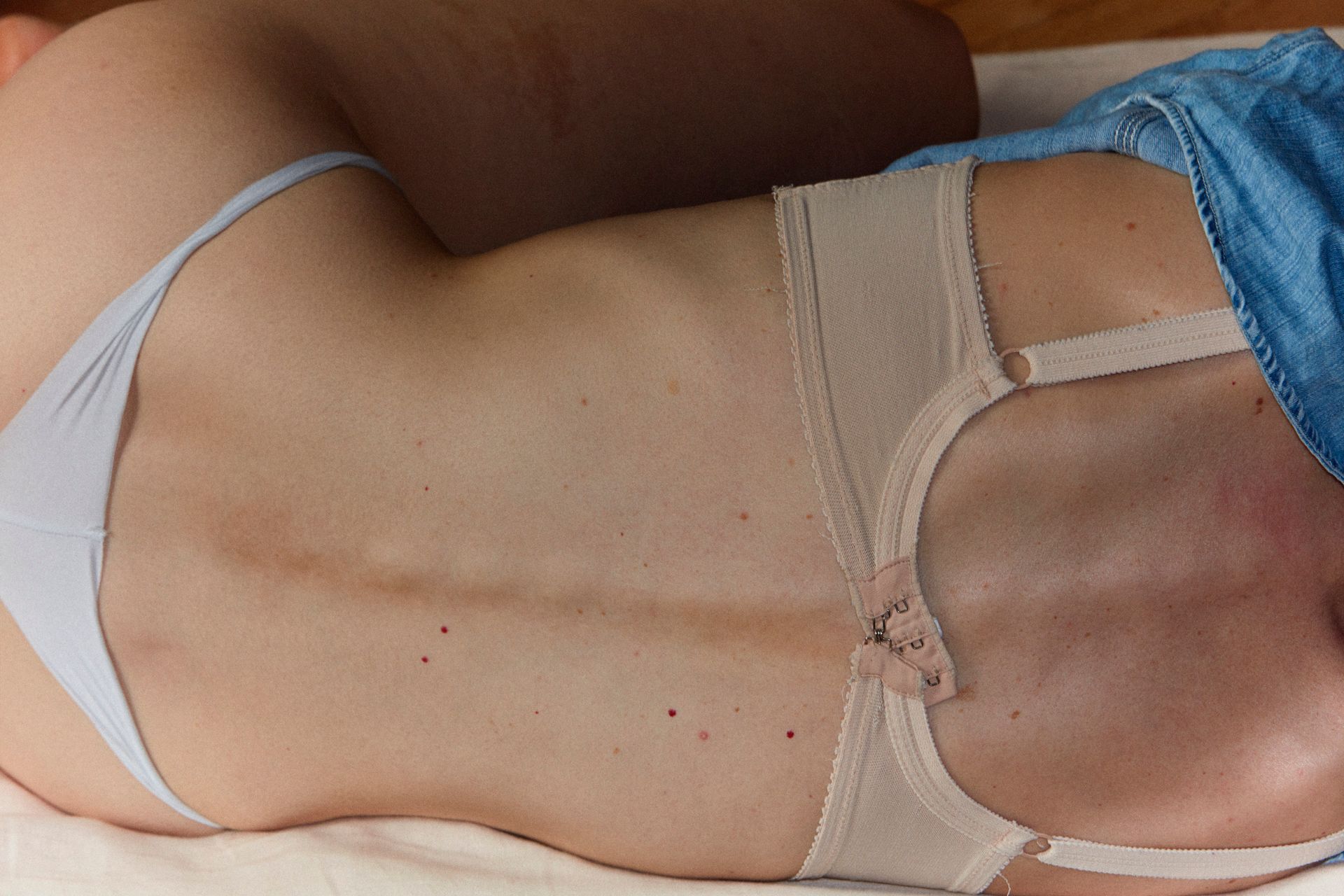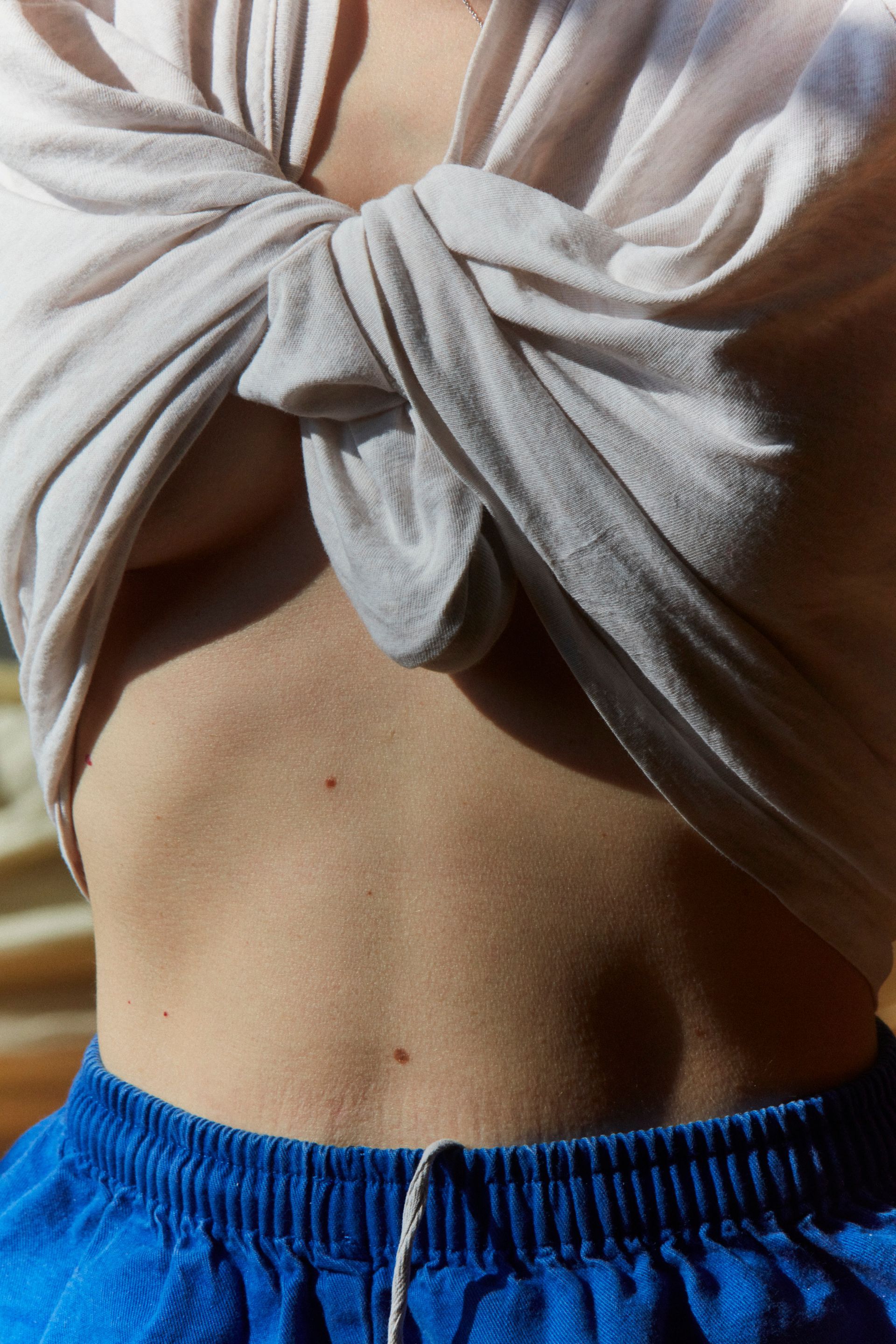 Velvet lips, corduroy. The socks are rolled-down, the shirt is rolled-up. Breasts upside down, the back is laying on the sheets, the belly tight, under the waistband. Tied-up top, bra and necklace fasteners.