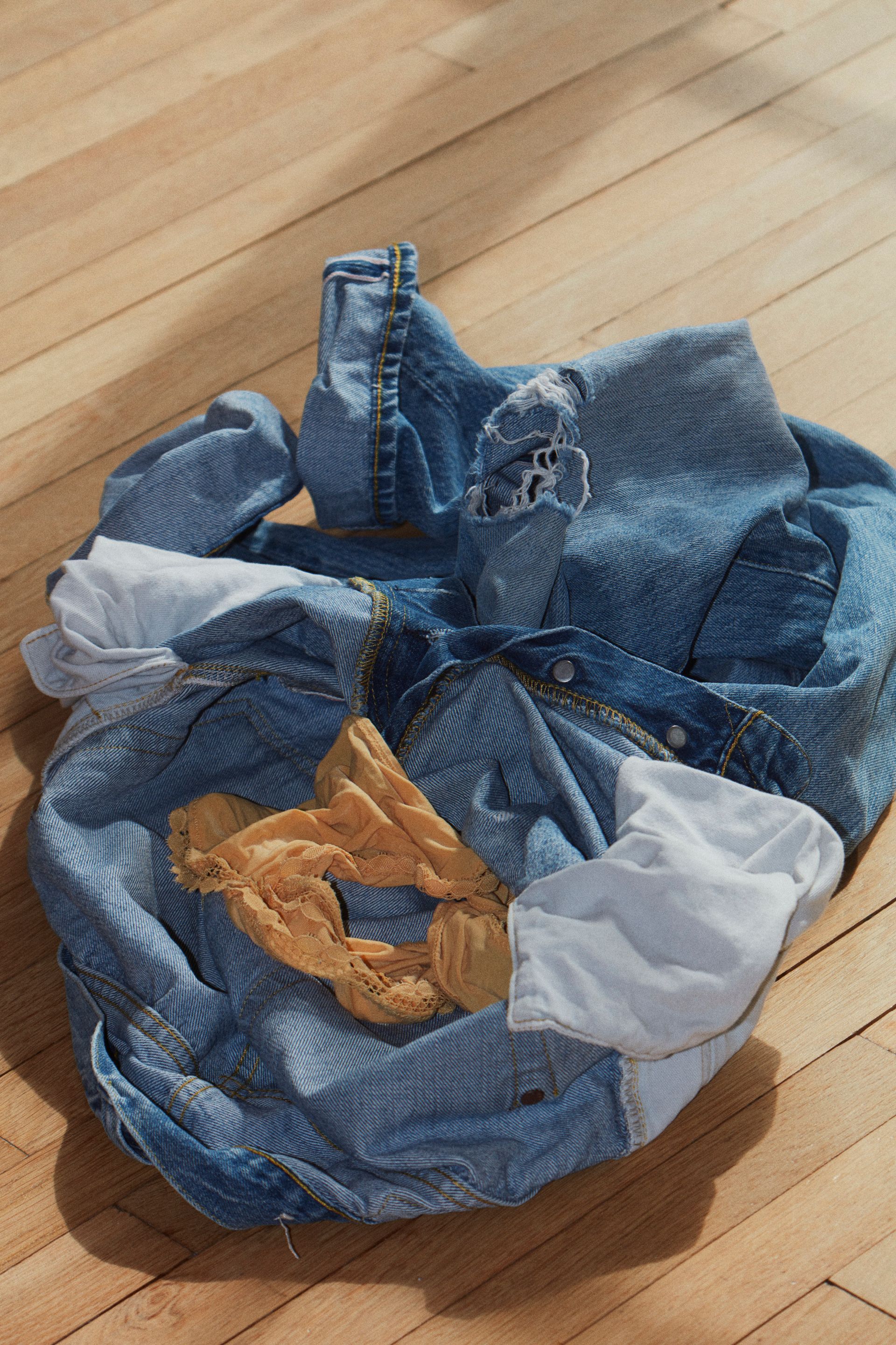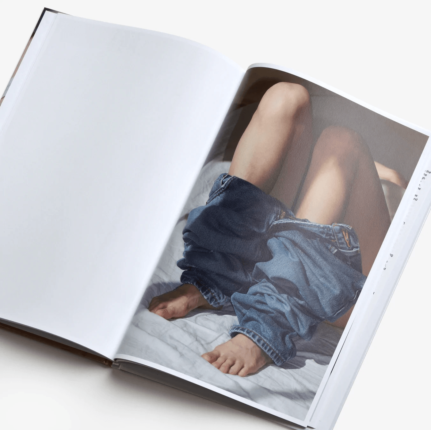 The photographer and his model are collaborating and elaborating images, progressively adding colours in the series, inflecting the poses of the body, the angle, and the view. Out of the well-known, out of what’s at hand – your body and clothes, your everyday belongings – they build new places and unveil new horizons. The photographs make canvas and paintings out of the cotton, sheets and jeans, the framing turns the body into a figure dancing from the tip of her fingers to the corner of her lips.