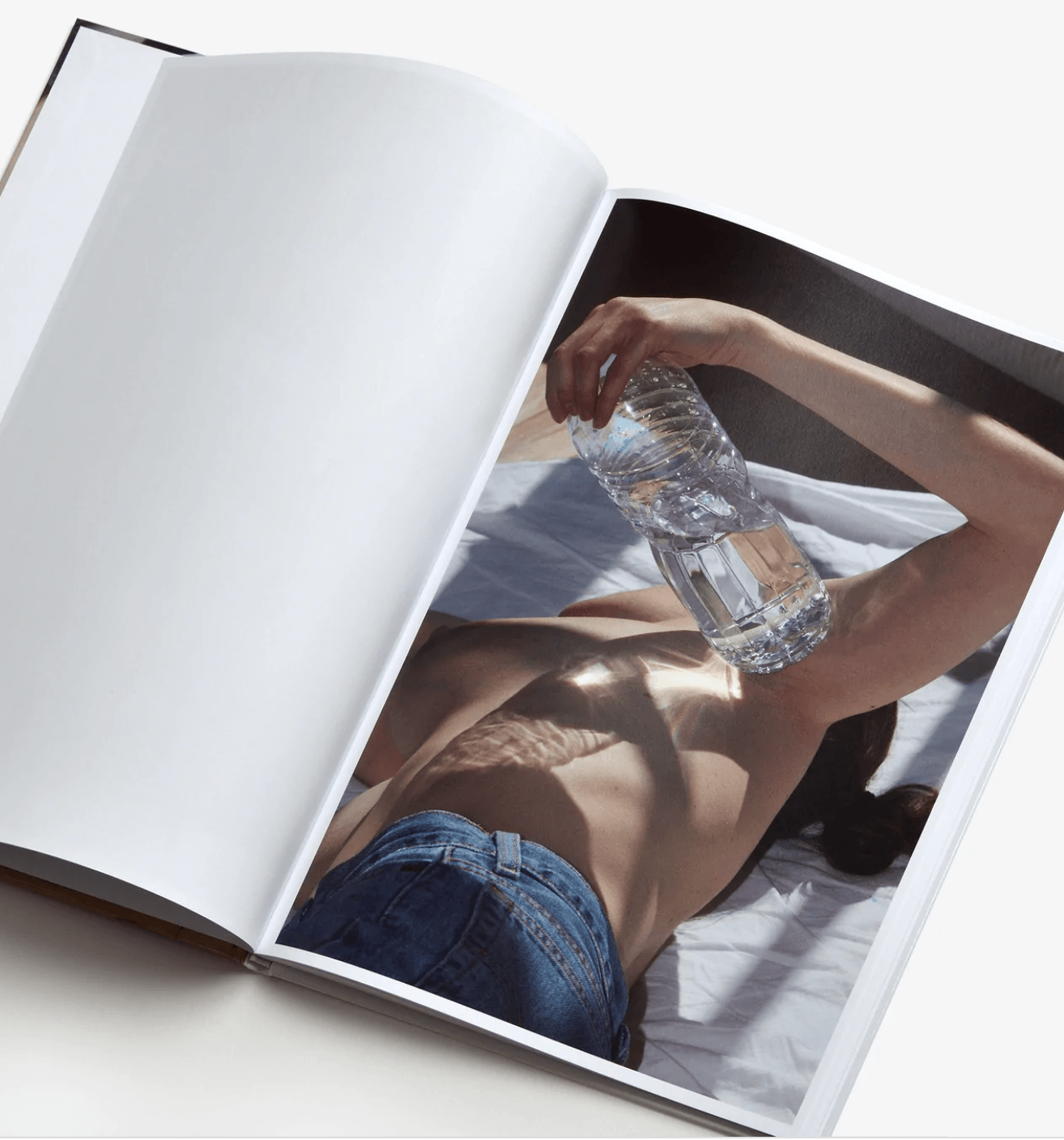 Her body in constantly renewed interaction with his eyes, as an everyday game between four walls. At home, the usual space, but they never go around in circles. Boredom is turned into leisure, monotony into languor. They are exploring, coupling a variety of settings with the many colour shades of her skin. Red clothing turned light pink once put on, transparent colours fading on her and highlighting her skin; shiny materials around, a steel chair, a bottle, the floor, bouncing colours off and around her.